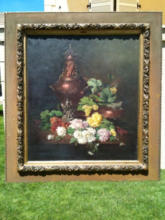 Картина больших размеров с изображенным на ней самоваром и цветами. На картине имеется подпись хужожника- Пастёр.